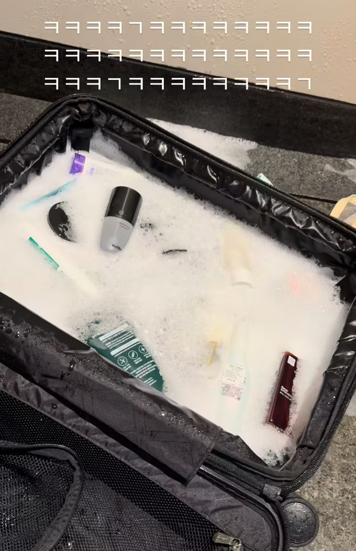 공개된 영상에는 캐리에 안이 거품으로 가득한 모습이 그대로 담겨 놀라움을 자아냈다. 샴푸 용기가 터지면서 캐리어 안에 있는 모든 물건들이 모두 거품물에 잠겨있다.