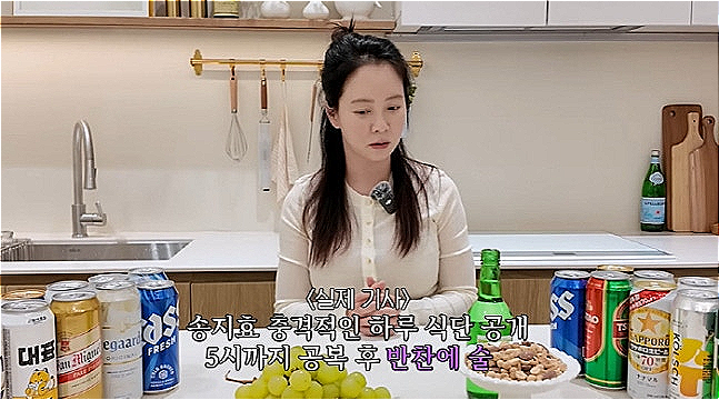 음주 빈도 또한 적지 않다. 송지효는 “2주 전까지만 해도 일주일에 5번 마셨다”고 밝히며, 그동안의 식습관에 대해 “오후 5시까지 공복으로 버티고 반찬과 술로 식사를 대신한 적도 있다”고 설명했다.