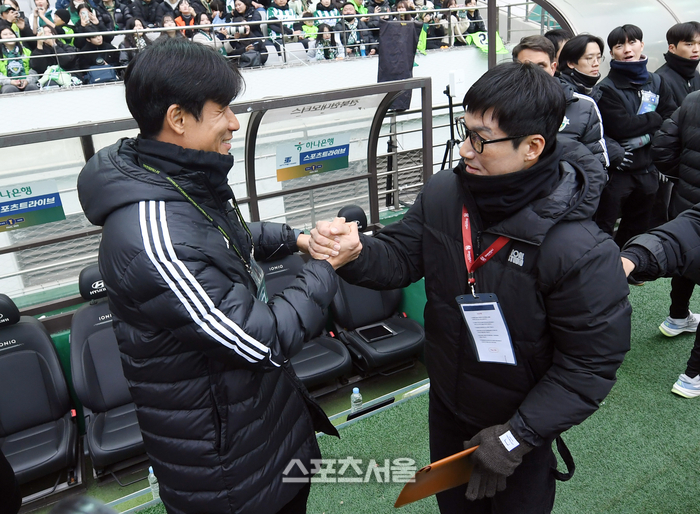 광주FC 이정효 감독(오른쪽)이 6일 서울월드컵경기장에서 열린 2025 하나은행 코리아컵 전북 현대와의 결승전에 앞서 전북 정조국 코치와 인사를 하고 있다. 2025. 12. 6.