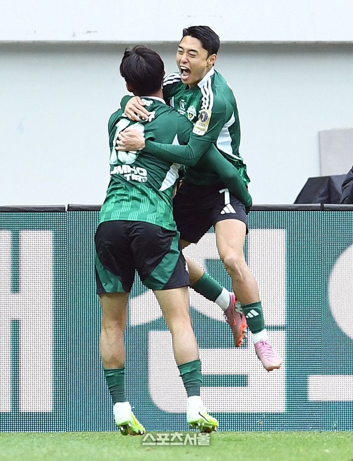 전북 현대 이동준(오른쪽)이 6일 서울월드컵경기장에서 열린 2025 하나은행 코리아컵 광주FC와의 결승전에서 선제골을 넣은 뒤 송민규와 함께 기뻐하고 있다. 2025. 12. 6.