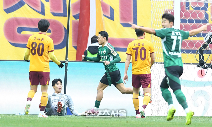 전북 현대 이동준(가운데)이 6일 서울월드컵경기장에서 열린 2025 하나은행 코리아컵 광주FC와의 결승전에서 선제골을 넣은 뒤 기뻐하고 있다. 2025. 12. 6.