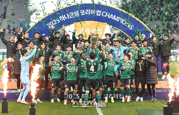 전북 현대 주장 박진섭과 선수들이 6일 서울월드컵경기장에서 열린 2025 하나은행 코리아컵 광주FC와의 결승전에서 2-1로 승리하며 우승을 차지한 뒤 트로피를 들어올리며 기뻐하고 있다. 전북은 K리그1에 이어 코리아컵까지 우승하며 더블을 달성했다. 2025. 12. 6.