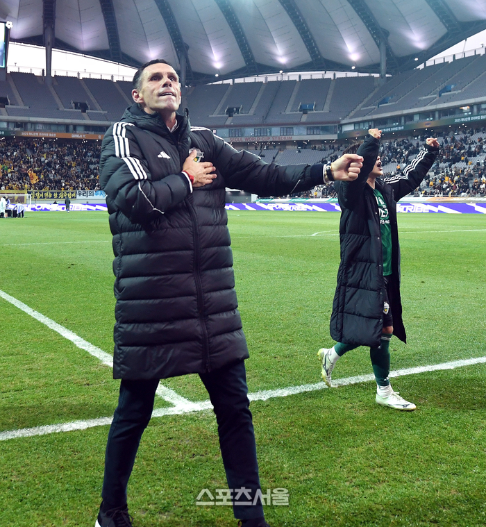전북 현대 거스 포옛 감독이 6일 서울월드컵경기장에서 열린 2025 하나은행 코리아컵 광주FC와의 결승전에서 2-1로 승리하며 우승을 차지한 뒤 이승우와 함께 팬들에게 인사를 하고 있다. 전북은 K리그1에 이어 코리아컵까지 우승하며 더블을 달성했다. 2025. 12. 6.