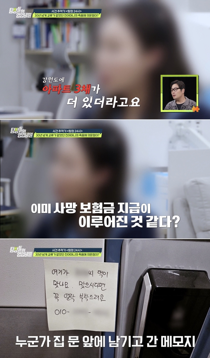 게다가 거주하던 빌라 외에도 어머니 명의로 강원도에 아파트 3채가 더 존재했다는 사실까지 드러난다. 생전 정신 질환으로 여러 시설을 옮겨 다녔던 의뢰인의 어머니가 어떻게 거액의 부채를 짊어진 채 아파트를 3채나 구입하게 된 걸지 의문이 증폭된다.