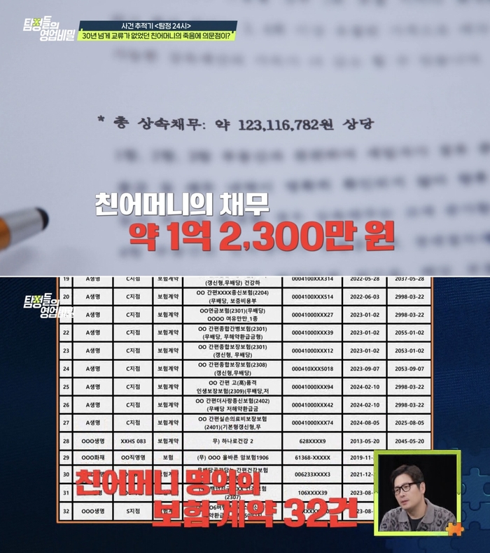 더욱 충격적인 것은 2014년부터 2024년까지 10년간 어머니 명의로 무려 32건의 보험 계약이 체결됐고, 이 중 20건이 사망보험이었다. 이미 사망보험금은 누군가에 의해 수령된 상태였다. 김풍은 “너무 수상한 냄새가 난다. 보통 사건이 아니다”라며 혀를 내두른다.