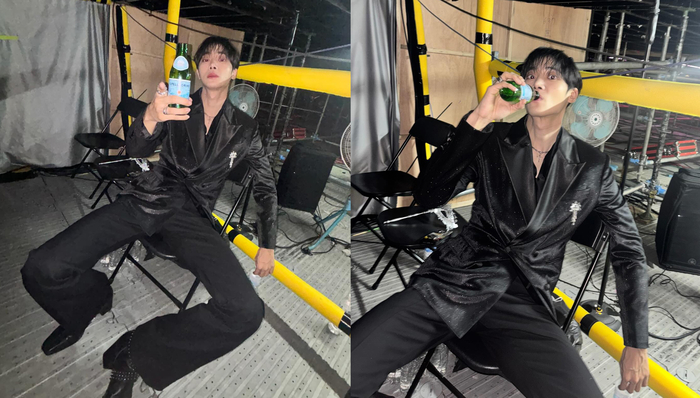 그린 색상의 생수병을 들고 소주를 마시는 듯한 유머러스한 포즈를 취해 팬들을 폭소케 했다.
