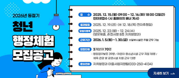 이번 동절기 행정체험은 참여 가능 대상을 대학생에서 19세~45세 춘천 청년 전체로 확대했다. 이를 통해 다양한 연령대의 청년이 행정 분야 진로 탐색과 취업 경쟁력 강화에 도움을 받을 것으로 기대된다.