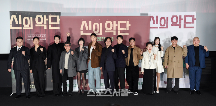 8일 서울 용산구 CGV 아이파크몰에서 진행된 영화 ‘신의 악단’ 제작보고회에서 출연 배우들이 취재진을 향해 포즈를 취하고 있다. 왼쪽부터 태항호, 남태훈, 한정완, 문경민, 고혜진, 정진운, 김형협 감독, 박시후, 서동원, 최선자, 신한결, 강승완, 장지건.