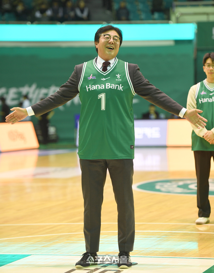 K리그 대전 황선홍 감독이 8일 부천체육관에서 열린 2025~2026 여자프로농구 하나은행과 신한은행의 경기 시투를 하고 있다.