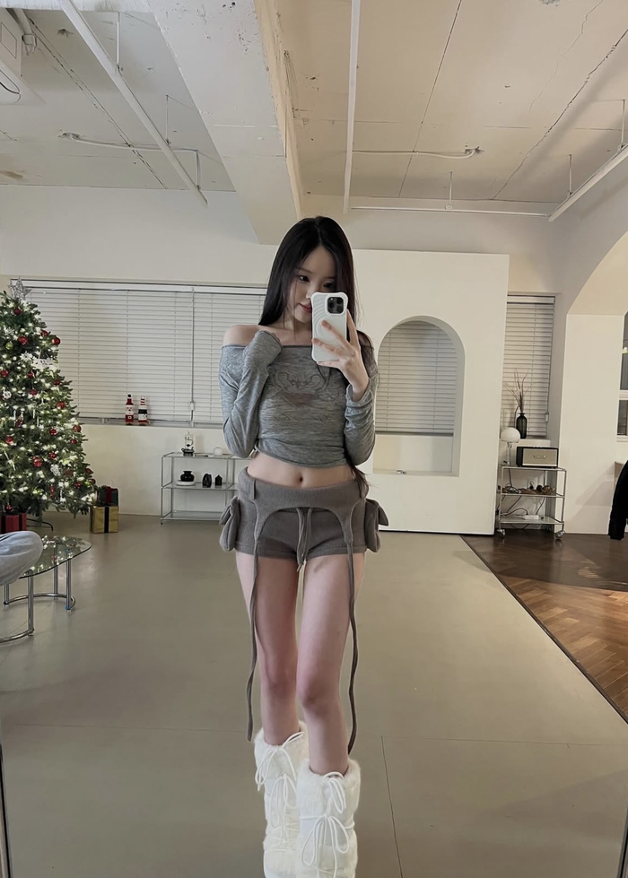 8일 강나언은 자신의 SNS에 눈꽃 이모티콘과 함께 크리스마스트리 앞에서 찍은 사진 여러 장을 업로드했다. 그는 얇은 오프숄더 티셔츠에 독특한 디자인의 반바지, 하얀 부츠를 매치해 사랑스러운 겨울 코디를 완성했다.