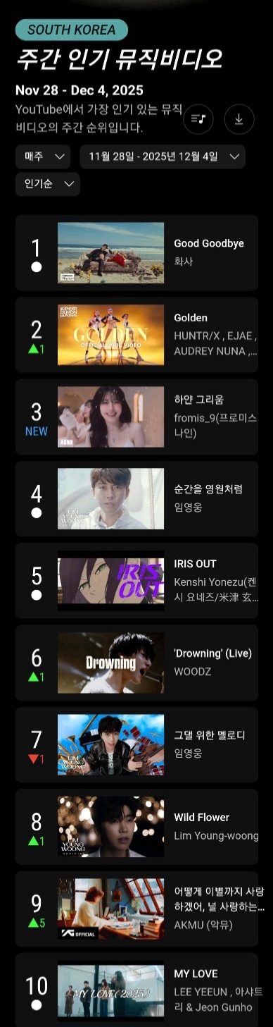 임영웅의 ‘순간을 영원처럼’, ‘그댈 위한 멜로디’, ‘들꽃이 될게요’ 뮤직비디오는 11월 28일부터 12월 4일까지 집계된 유튜브 한국 주간 인기 뮤직 비디오에서 각각 4위, 7위, 8위에 올랐다.