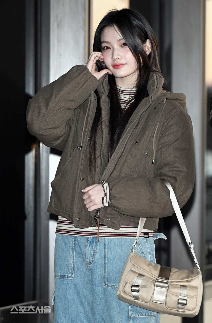 이날 이로하는 카키 톤의 크롭 재킷을 메인 아이템으로 선택해 시선을 사로잡았다. 올리브 그린 컬러의 재킷은 스웨이드 느낌의 질감과 박시한 핏으로 빈티지 무드를 자아냈다. 짧은 기장의 재킷은 허리 라인을 강조하며 경쾌한 실루엣을 완성했다.