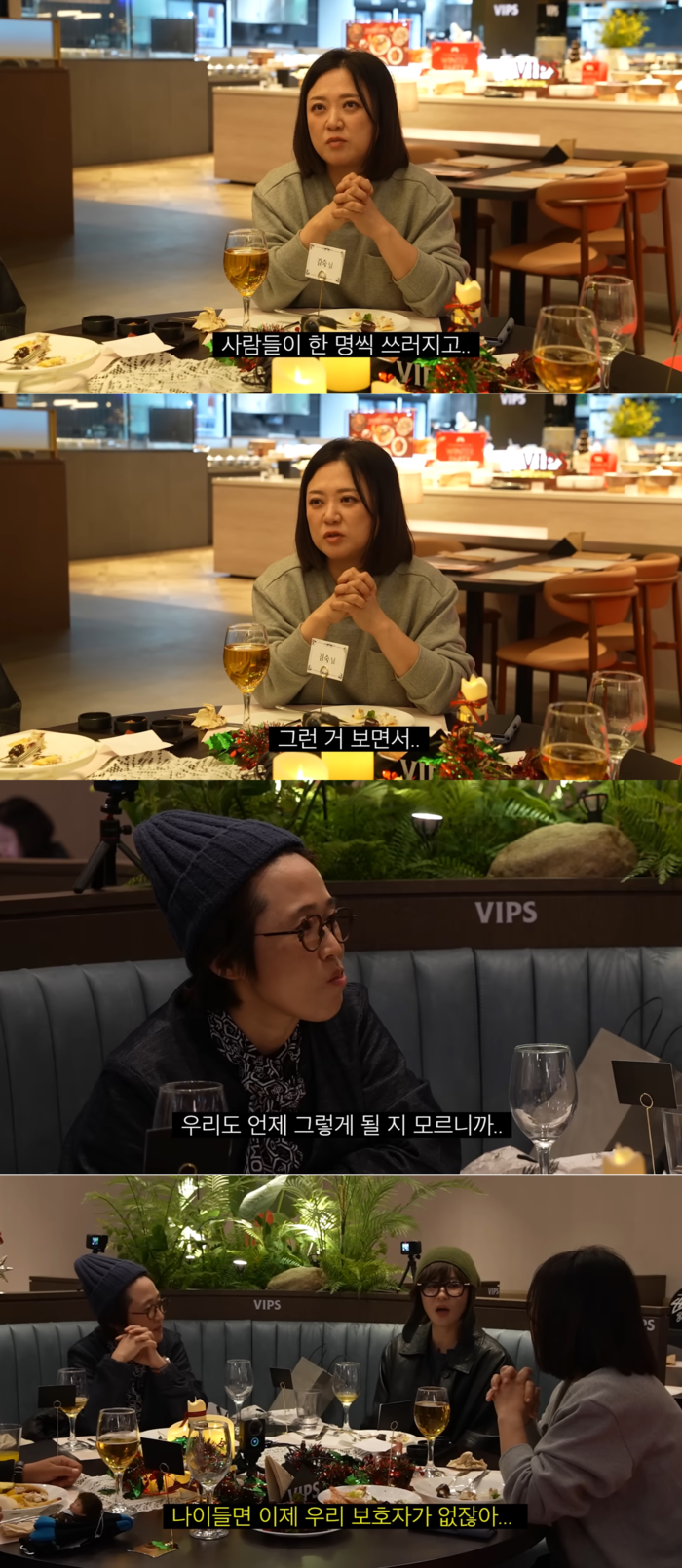 이어 김숙은 “똑같은 옷을 맞춰 입고 똑같은 신발을 신고 한 동네에서 살았으면 좋겠다”면서 “주변에 사람들이 한명씩 쓰러지고 그런거 보면서 우리도 언제 그렇게 될 지 모르니까 주변에 같이 있었으면 좋겠다”며 진솔한 마음을 전했다. 이에 최강희는 “나이들면 이제 우리 보호자가 없지 않냐”고 공감했다.