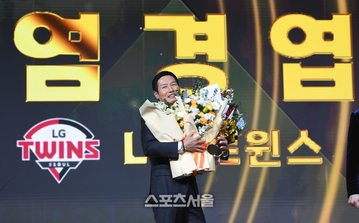 LG 염경엽 감독이 9일 서울 송파 롯데호텔 월드에서 열린 2025 KBO 골든글러브 시상식에서 올해의 감독상을 수상한 후 축하꽃다발을 받고 있다.