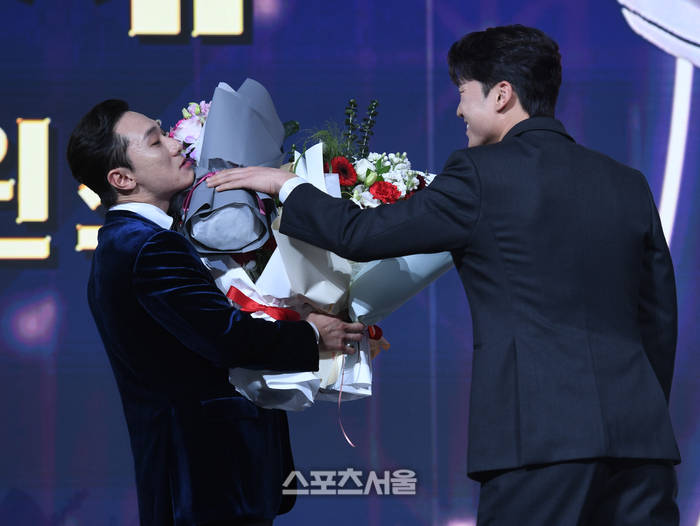 LG 신민재가 9일 서울 송파 롯데호텔 월드에서 열린 2025 KBO 골든글러브 시상식에서 2루수 부문 수상 후 박해민의 축하꽃다발을 받고 있다.