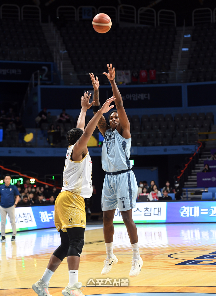 소노 네이던 나이트(오른쪽)가 9일 고양소노아레나에서 열린 2025-2026 프로농구 정관장과의 경기에서 정관장 브라이스 워싱턴의 수비를 피해 3점슛을 던지고 있다. 2025. 12. 9.