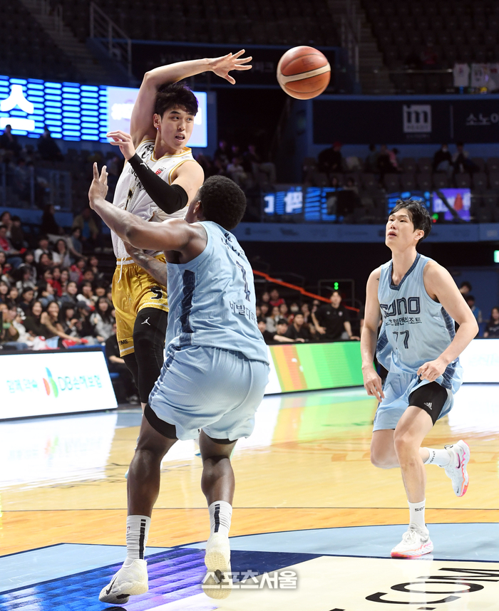 정관장 변준형(왼쪽)이 9일 고양소노아레나에서 열린 2025-2026 프로농구 소노와의 경기에서 골밑으로 파고들다가 동료에게 패스를 하고 있다. 2025. 12. 9.
