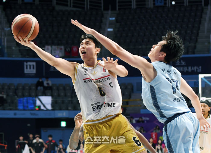 정관장 박지훈(왼쪽)이 9일 고양소노아레나에서 열린 2025-2026 프로농구 소노와의 경기에서 소노 최승욱의 수비를 피해 슛을 하고 있다. 2025. 12. 9.