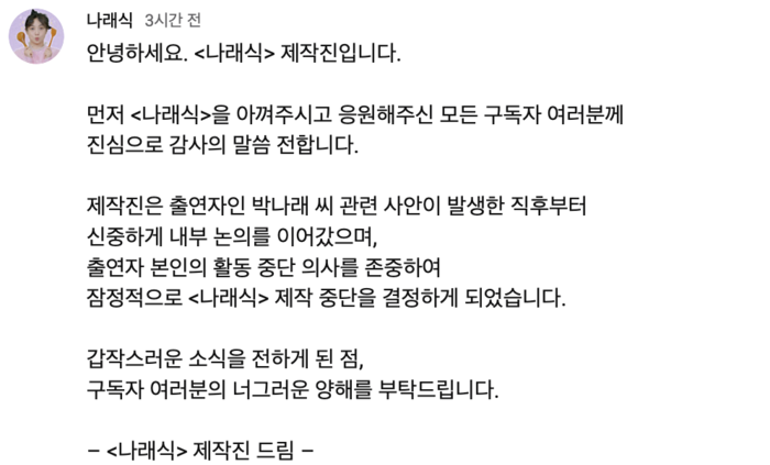 유튜브 채널 ‘나래식’도 잠정 제작 중단을 알렸다.