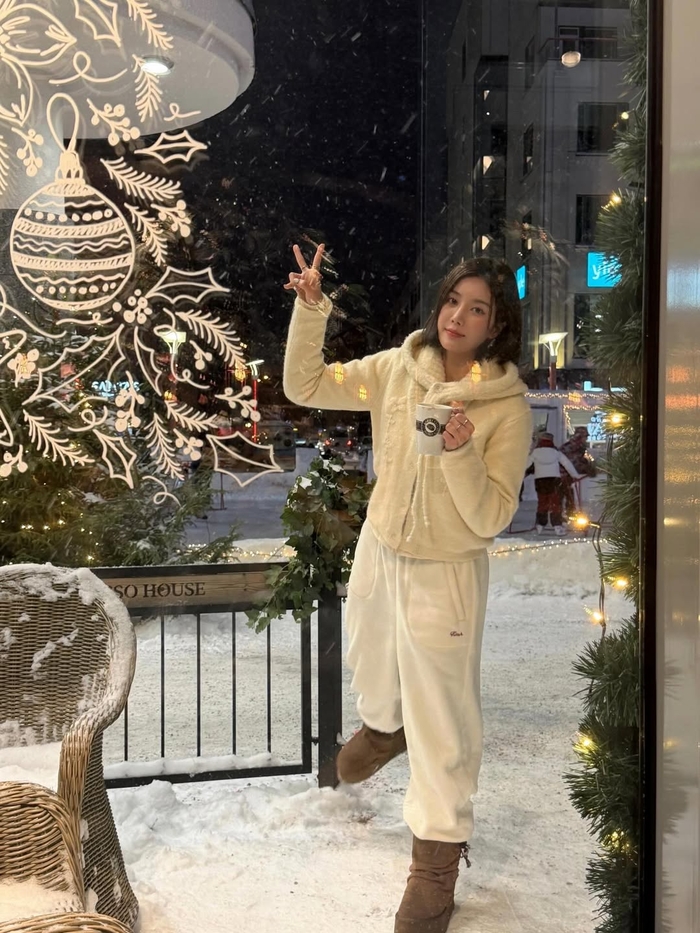 권은비는 크리스마스 장식으로 꾸며진 카페 앞에서 따뜻한 음료를 마시며 여유로운 겨울 감성을 즐기는 모습이 담겼다. 포근한 크림 컬러 후드 점퍼와 털 부츠로 완성한 룩이 눈부신 설경과 어우러지며 ‘겨울 요정’ 같은 분위기를 자아냈다.