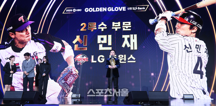 신민재가 9일 서울 송파구 롯데호텔월드에서 열린 2025 KBO 골든글러브 시상식에서 2루수 부문을 수상했다. 본인 첫 골든글러브인 동시에 31년 만에 나온 LG 출신 2루수 골든글러브다.