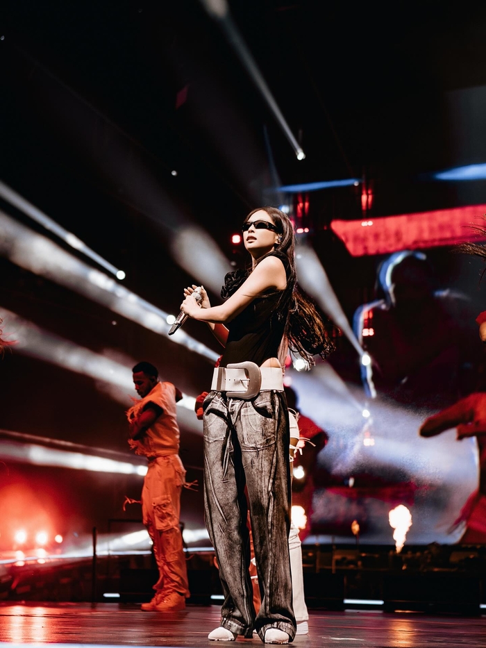 또 다른 사진에서는 오버사이즈의 화이트 벨트의 올블랙 상의와 와이드 팬츠를 착용, 힙하면서도 스타일리시한 매력을 발산했다..