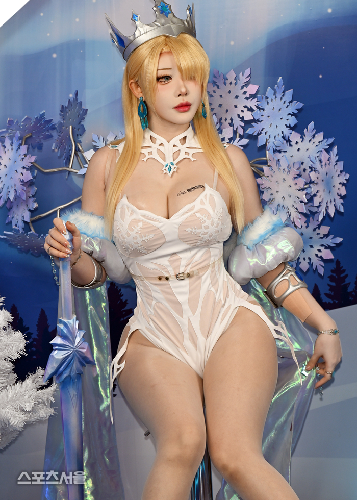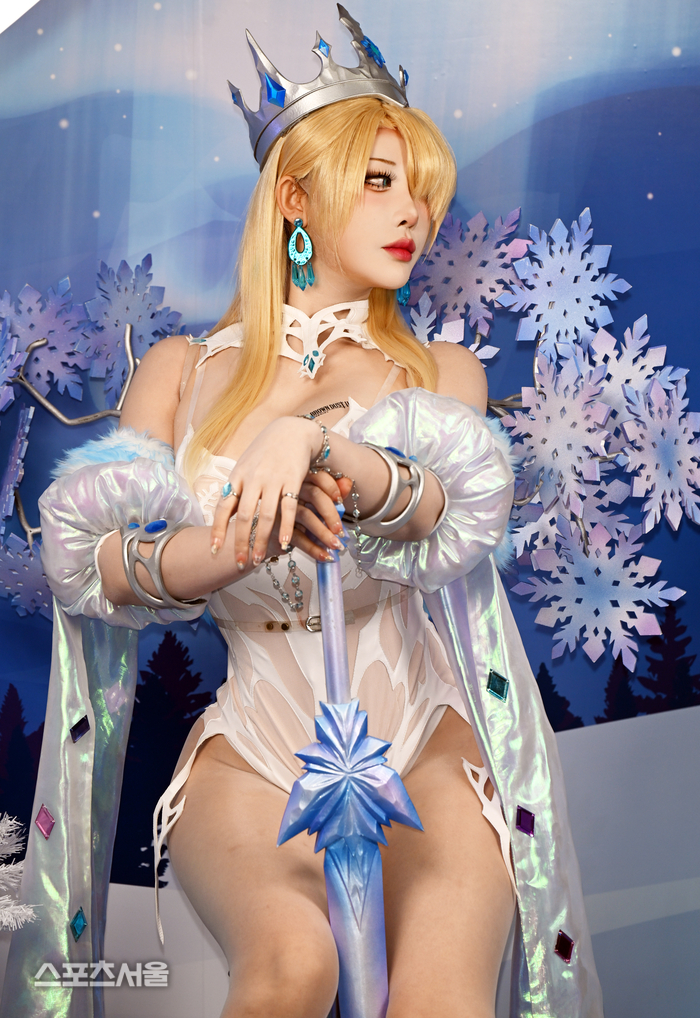 야살은 의상뿐 아니라 소품 활용에도 공을 들였다. 투명 아크릴 소재에 블루 크리스탈이 장식된 빙설 지팡이는 캐릭터의 상징성을 강조했으며, 눈송이 장식이 가득한 배경 세트와의 조화로 마치 게임 속 한 장면이 현실로 구현된 듯한 연출을 완성했다. 화이트와 블루 그라데이션의 퍼 장식 역시 겨울 왕국의 이미지를 강화하는 요소로 작용했다.
