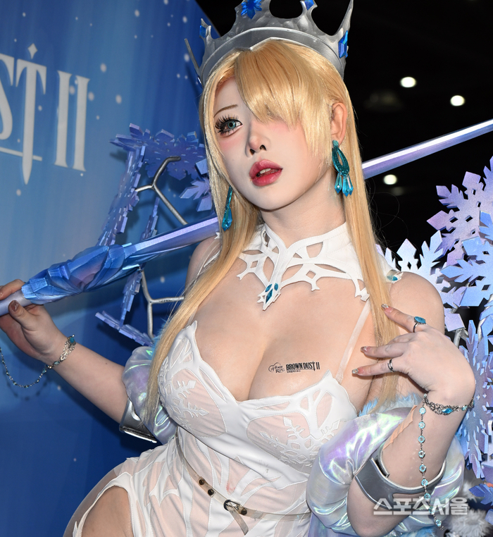 야살은 이번 행사에서 브라운 더스트 2의 빙설 테마 캐릭터를 선보였다. 백색 레이스와 시스루 소재가 조화된 코르셋 스타일 의상은 캐릭터의 고급스러운 이미지를 그대로 구현했다. 특히 홀로그램 소재의 망토는 빛의 각도에 따라 은은한 무지갯빛 펄을 발산하며 환상적인 분위기를 연출했다.