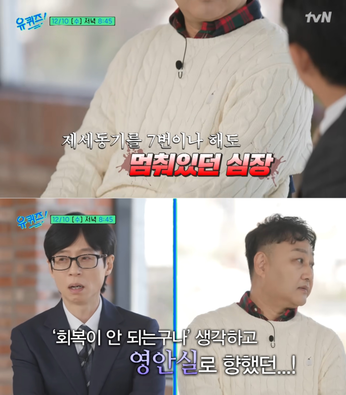 그는 “내 혀가 말렸다고 하더라. 김숙씨가 기도가 안 막히도록 혀를 잡아당겼다. 임형준씨는 비상으로 갖고 있던 응급혈관확장제를 내 입에 밀어 넣었다”며 “제세동기를 7번이나 해도 심장이 뛰지 않았다. 회복이 안 되는구나 생각해 영안실로 향했다”며 아찔했던 당시 상황을 설명했다.