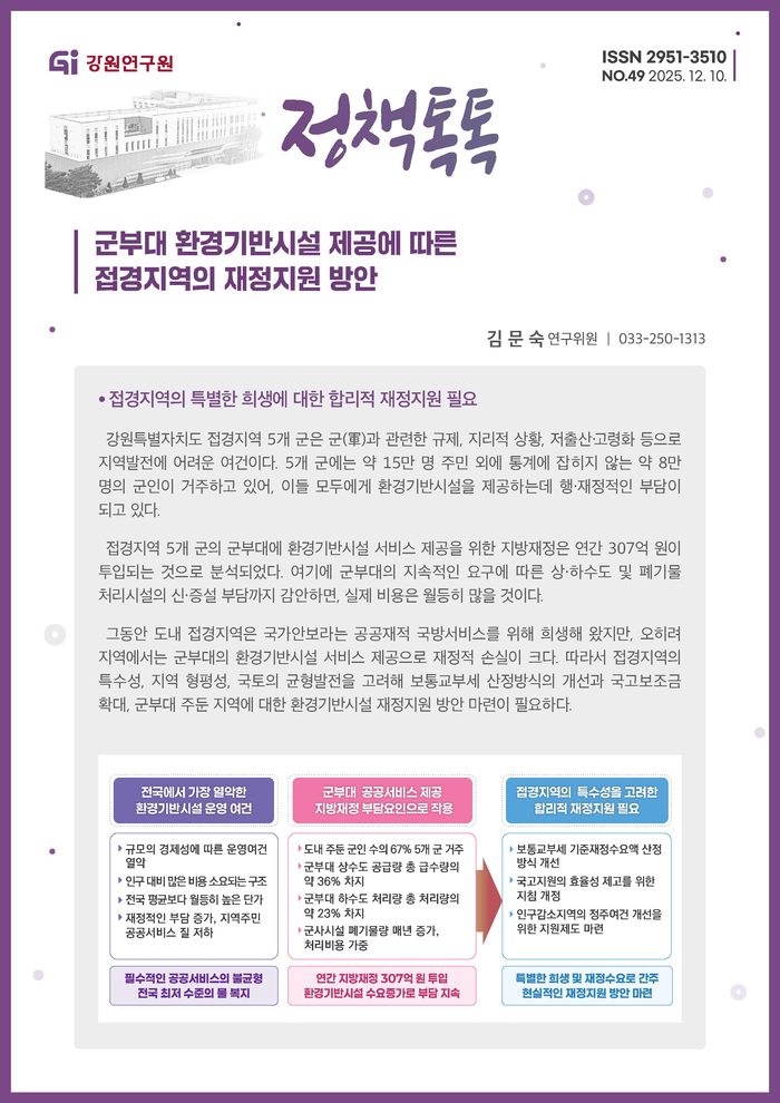 [스포츠서울ㅣ춘천=김기원기자]강원연구원(원장 배상근)은 「군부대 환경기반시설 제공에 따른 접경지역 재정지원 방안」을 주제로 한 2025년 제49호 정책톡톡을 발간했다.