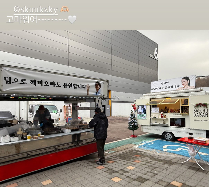 커피차에는 “지니야 혜교 언니를 응원합니다”라는 메인 문구가 그리고 옆에 놓인 분식차에는 공유가 출연했던 드라마 ‘도깨비’를 연상시키는 별명인 “덤으로 깨비오빠도 응원합니다”라는 문구가 적혀 웃음을 안겼다.