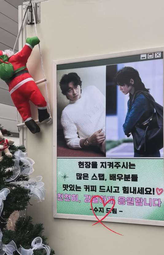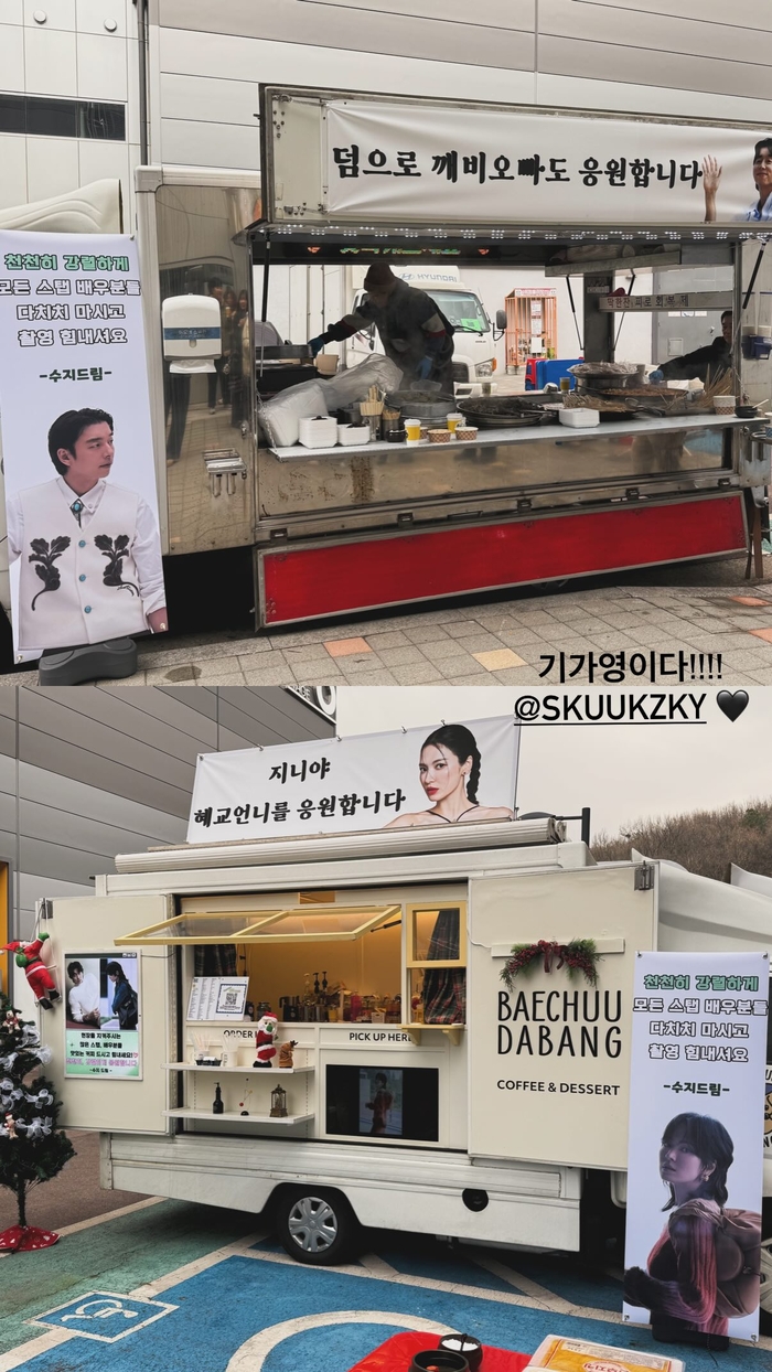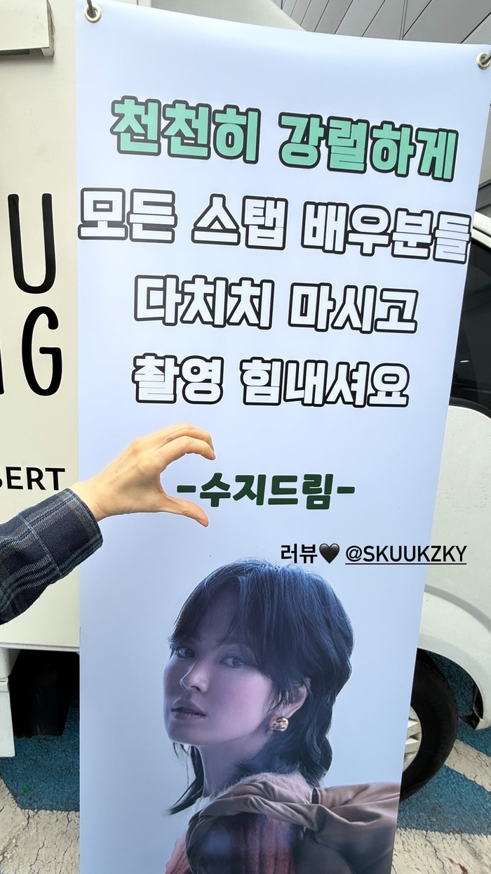 현장 스태프 및 배우들을 향한 응원 배너에는 “천천히 강렬하게 모든 스탭 배우분들 다치치 마시고 촬영 힘내세요 -수지드림-”이라는 진심이 담긴 격려가 더해졌다.