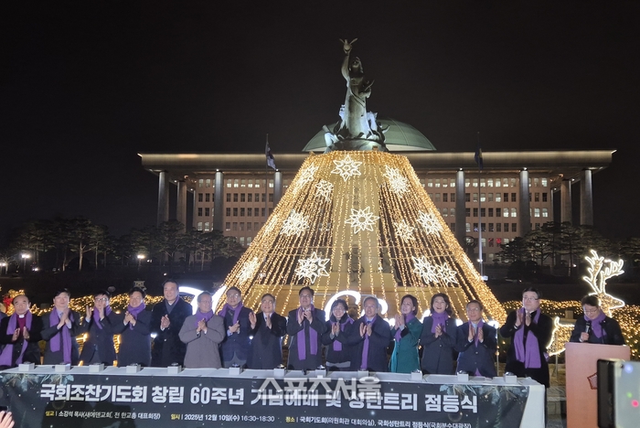 [스포츠서울 | 이상배 전문기자] 10일 저녁 우원식 국회의장(왼쪽 아홉 번째)과 여야 의원들을 비롯한 내빈들이 국회에서 열린 국회 조찬 기도회 창립 60주년 기념 성탄 트리 점등식에 참석 분수대에 설치된 성탄 트리에 불을 밝힌 후 손뼉을 치고 있다. sangbae0302@sportsseoul.com