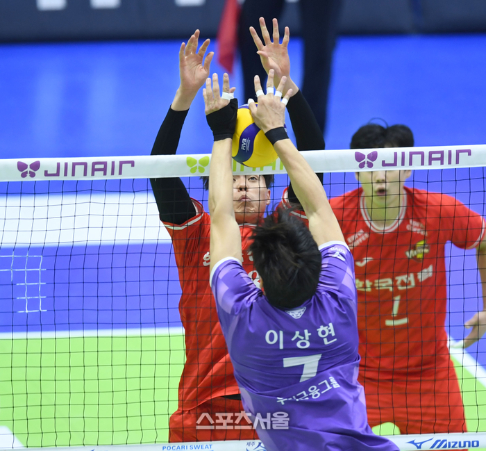 한국전력 전진선이 10일 수원체육관에서 열린 2025~2026 V-리그 우리카드와 경기에서 상대 이상현과 네트 위에서 볼다툼을 하고 있다.