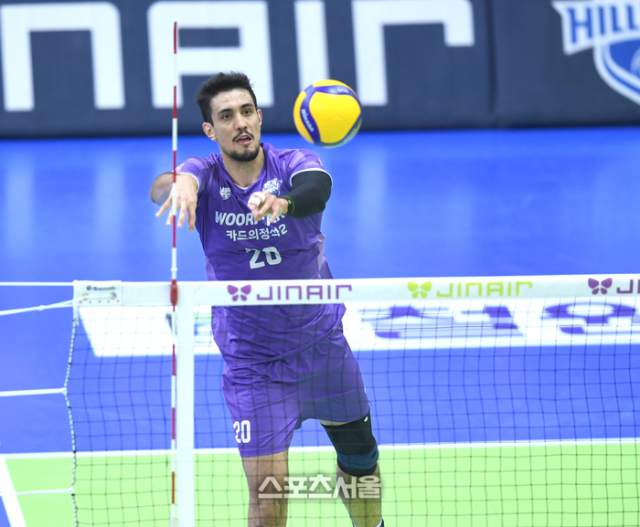 우리카드 아라우조가 10일 수원체육관에서 열린 2025~2026 V-리그 한국전력과 경기에서 볼을 상대 진영으로 넘기고 있다.