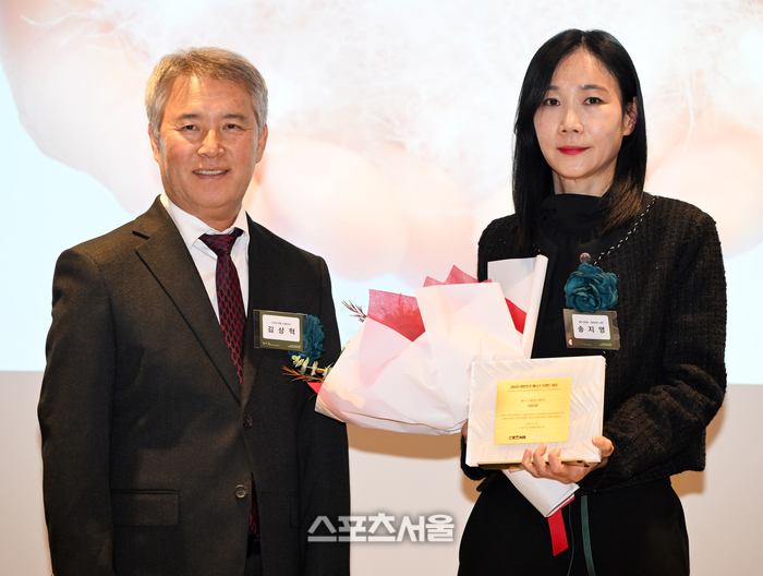 김상혁 스포츠서울 대표가 웰니스 혁신 소재 부문 수상자인 주식회사 신주원 디보다운의 이관우 대표를 대리한 송지영 상무(오른쪽)와 기념촬영을 하고 있다.