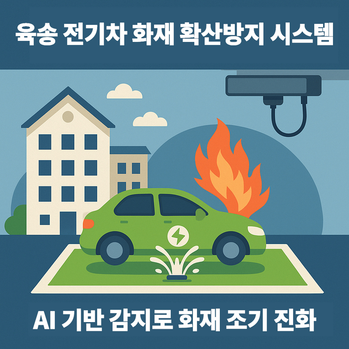 육송의 ‘전기차 화재 확산방지 시스템’은 화재 발생 시 신속한 초기 대응에 특화된 기술이다. 불꽃감지기와 바닥형 열감지기가 화재 징후를 AI 기반으로 즉각 포착하면, 차량 하부와 측면에 설치된 노즐에서 분당 240L의 소화수가 3kgf/cm² 이상의 고압으로 분사된다.