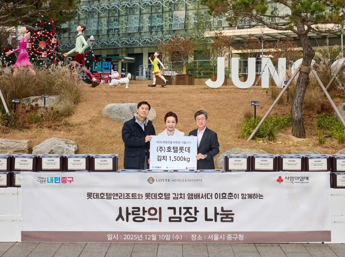 이날 서울 중구청에서 ‘김치 앰배서더 이효춘과 함께하는 사랑의 김장 나눔 행사’도 진행됐다. 배우와 호텔 임직원 30여 명이 직접 김장한 1500kg의 롯데호텔 배추김치를 서울 중구청에 전달하며 지역사회에 따뜻한 나눔을 실천했다.