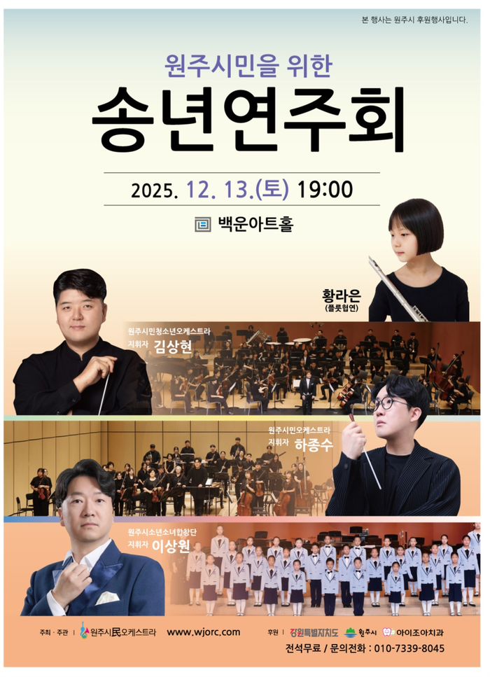 박혜순 문화예술과장은 “2025년의 마무리를 앞두고 지역사회가 문화생활을 즐기며 소통할 수 있는 자리를 마련하고자 이번 음악회를 준비했다”며 “많은 시민이 함께해 음악으로 한 해를 따뜻하게 마무리하시길 바란다”라고 말했다.