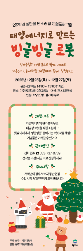 [스포츠서울ㅣ원주=김기원기자]원주시는 성탄절을 맞아 오는 25일부터 27일까지 3일간 기후변화홍보관에서 관내 초등학생을 대상으로 ‘2025년 성탄절 탄소중립 체험프로그램’을 운영한다.