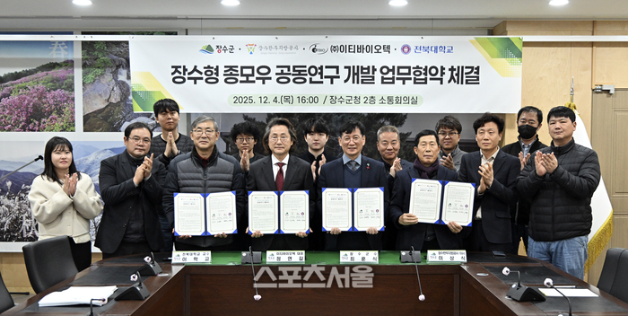 [스포츠서울 ㅣ 장수=고봉석 기자] 전북 장수군은 장수한우지방공사, 이티바이오텍(주), 전북대학교와 장수군청 회의실에서 장수한우 품질 고급화를 위한 ‘장수형 저탄소 종모우 개발’ 공동연구 상호협력 업무협약(MOU)을 체결했다고 11일 밝혔다.