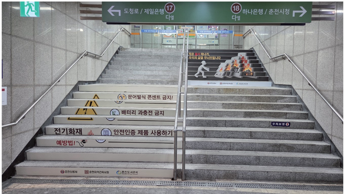 계단 부착물에는 ▲소방안전공모전 당선작 표어 ▲전기화재 예방법 ▲차량용소화기 비치 의무화 ▲주택용소방시설 설치 ▲비상구 폐쇄 금지 등 내용이 기재돼 있다.