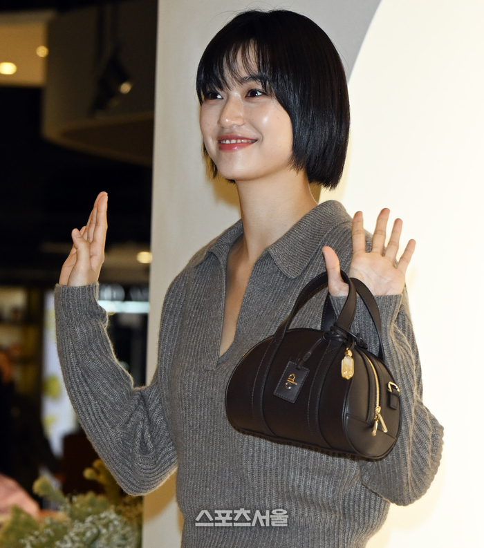 헤어는 턱선 길이의 블랙 단발로 시크한 분위기를 강조했다. 앞머리는 자연스럽게 이마에 흘러내리도록 스타일링해 청순하면서도 도시적인 이미지를 연출했다. 메이크업은 코럴 핑크 톤 립과 내추럴한 베이스로 건강한 피부 톤을 살렸으며, 환한 미소로 친근한 매력을 전했다.