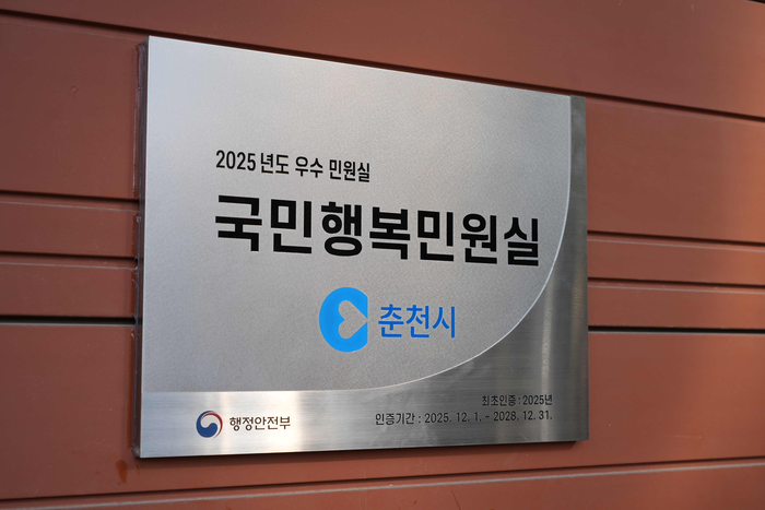 [스포츠서울ㅣ춘천=김기원기자]춘천시(시장 육동한)는 12일 시청 1층 동문에서 ‘국민행복민원실’ 인증 현판식을 열었다. 이번 현판식은 행정안전부 국민행복민원실 신규 인증과 전국 우수기관 선정 성과를 시민과 공유하고 춘천시 민원서비스의 우수성을 알리기 위해 마련됐다.