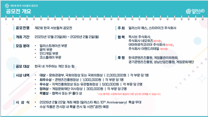 이러한 흐름 속에서 ‘일러스타 페스’는 단순 행사 개최를 넘어 창작자 발굴과 성장 구조로 영역을 확장하고 있다. 그 대표 사례가 ‘한국 서브컬처 공모전’이다. 오는 12월부터 진행되는 ‘제2회 한국 서브컬처 공모전’은 일러스트레이션, 음악, 인디게임, 코스플레이 등 4개 부문을 대상으로 하며, 수상작은 2026년 2월 열리는 ‘일러스타 페스 10th Anniversary’ 특설 무대에서 전시 및 시연된다