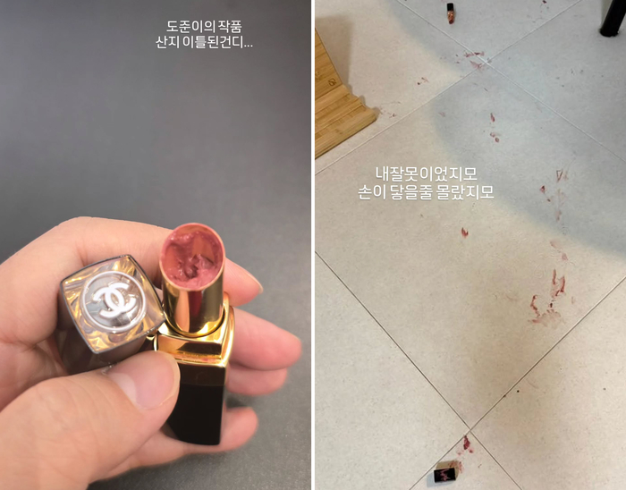 정주리는 이어 립스틱 내용물이 바닥 타일에 난장판으로 묻어있는 ‘사고 현장’ 사진까지 공개하며 “내 잘못이었지모 손이 닿을 줄 몰랐지모”라고 자책 섞인 코멘트를 덧붙였다.