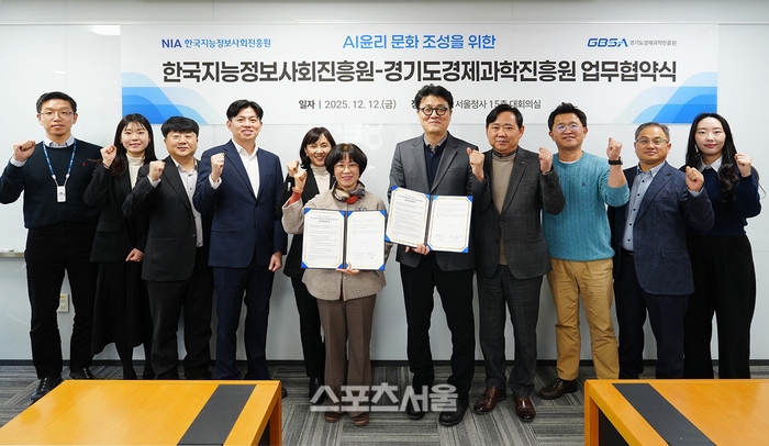 〔스포츠서울│수원=좌승훈기자〕경기도경제과학진흥원은 12일 한국지능정보사회진흥원(NIA)과 AI·디지털 윤리 역량 강화 및 책임 있는 기술 활용 문화를 확산하기 위한 업무협약(MOU)을 체결했다.
