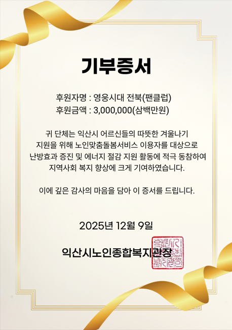 영웅시대 전북방은 이달 9일 지역사회 취약계층을 위해 300만원의 기부금을 익산시 노인종합복지관에 전달했다. 전달된 기부금은 노인맞춤돌봄서비스를 이용하는 어르신 중 경제적으로 어려움을 겪는 어르신과 취약계층 가구를 대상으로 사용될 예정이다.