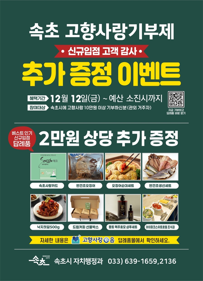 속초시 관계자는 “올 한 해 속초시를 향해 많은 응원과 사랑을 보내주신 기부자분들께 감사드린다”며 “이번 이벤트를 통해 신규 답례품 홍보 효과를 높이고 제도 운영 4년 차를 맞은 2026년에도 답례품 구성과 품질관리 강화로 차별화된 제도 운영과 고품질 지역 특산품 전략을 이어나가겠다”고 말했다.