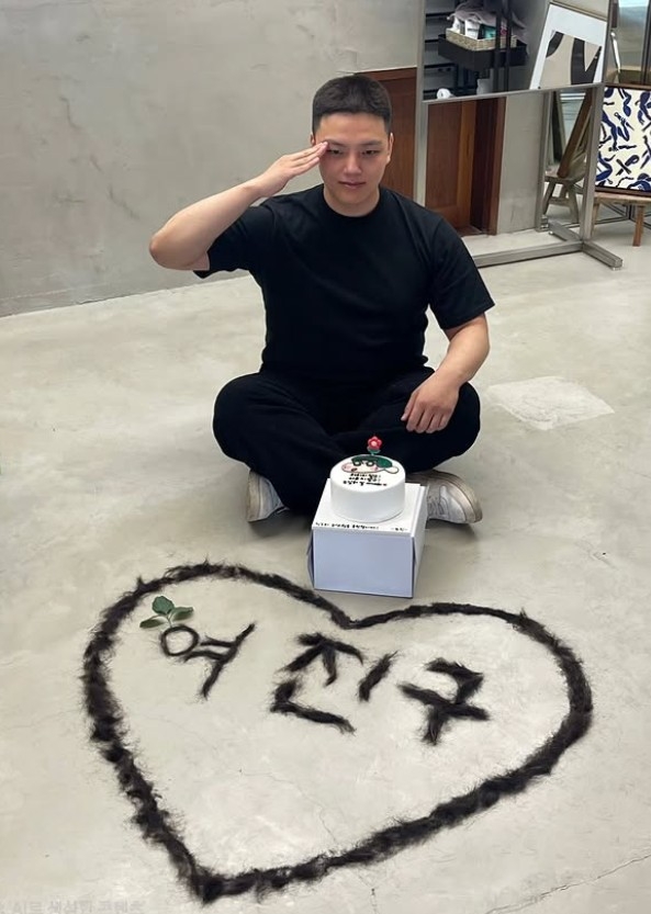 짧은 머리를 한 채 한 손으로 경례하며 군인이 될 준비를 마친 모습이다. 자른 머리카락으로 자신의 이름과 함께 하트를 만들어 눈길을 끌었다.